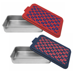 9 x 13" Aluminum Cake Tin with Custom Donut Theme Lid. Available with either Red or Blue Lid
